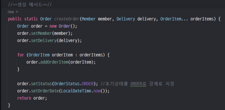 생성자로도 할 수 있는 것인데, 왜 굳이 정적 생성 메서드라는 것을 static으로 만들어 사용했는지 잘 와닿지 않았다. 생성자와 달리 생성 메서드의 장점은 의도를 더욱 잘 드러낼 수 있는 이름을 사용할 수 있다는 것이다. 현재 createOrder()메서드를 통해 단순히 생성자를 사용하는 것보다 명시적으로 Order객체를 만드는 메서드임을 더 잘 드러내주는게 생성메서드의 장점이라고 한다. ※실무에서는 한 가지 정적 생성메서드가 아닌, 매개변수를 달리해서 객체를 생성해야할 경우도 생긴다고 한다. 다소 억지스러울 수 있는 예시를 들자면, 상품 주문 시에 배달 주소를 필수적으로 입력하는 것이 아니라, 도중에 요구사항이 바뀌어 주문 시에 배달 주소를 '선택적으로' 입력할 수 있게 되었다고 가정해보자. 그렇게 ..