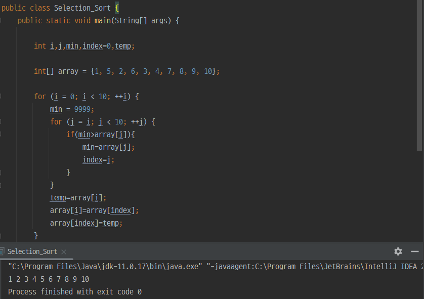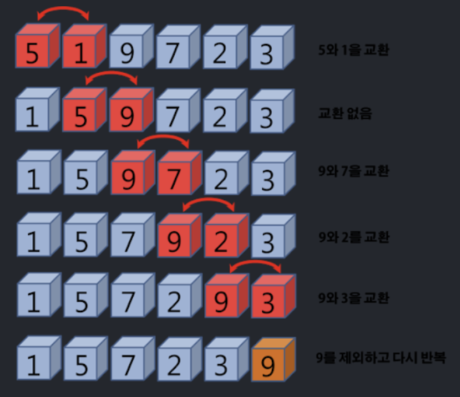다음의 숫자들을 오름차순으로 정렬하는 프로그램을 작성하세요. 1 5 2 6 3 4 7 8 9 10 위 문제에 대해서 정렬 알고리즘 중 "버블정렬(Bubble Sort)"를 사용하여 1 5 2 6 3 4 7 8 9 10 -> 1 2 3 4 5 6 7 8 9 10 으로 정렬을 해보자. 앞서 언급했던, 선택정렬(Selection Sort) 문제와 동일한 문제이다. 버블 정렬(Bubble Sort)는 쉽게 말해서, 인접해 있는 값과 비교해서 더 작은 값을 앞으로 보내는 것!!! 위 사진처럼 인접한 두 요소 값을 비교하고 i > i+1 의 대소관계를 가지면, 작은 값이 앞에 위치하도록 교체한다. 선택 정렬(Selection Sort)은 0번째 인덱스부터 작은 수가 먼저 차례대로 정렬되었다면, 버블 정렬(Bubbl..